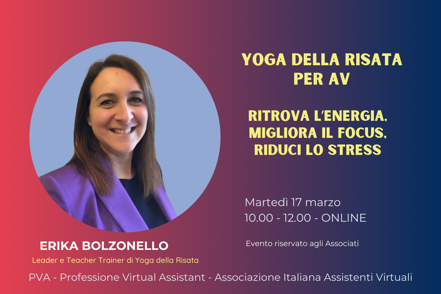 Scopri come ritrovare energia, migliorare il focus e ridurre lo stress attraverso lo Yoga della Risata. In questa masterclass pratica con Erika Bolzonello sperimenterai esercizi di respirazione e risata consapevole per gestire meglio la pressione del lavoro digitale e ritrovare lucidità mentale ed energia nella tua giornata professionale.